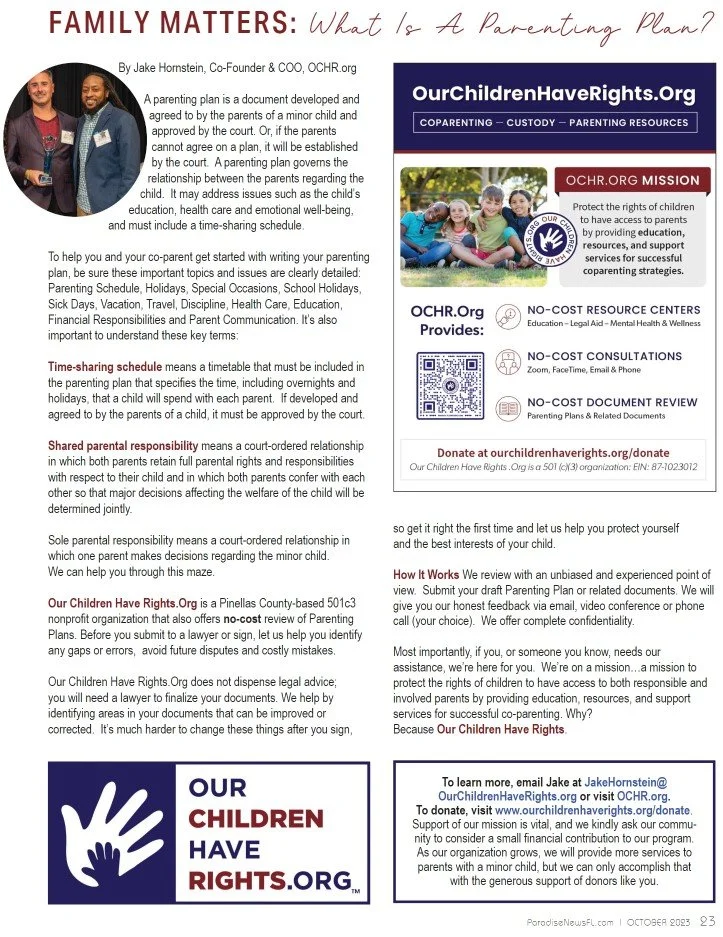 Our Children Have Rights.Org is a Pinellas County-based 501c3 nonprofit organization that also offers no-cost review of Parenting Plans. Before you submit to a lawyer or sign, let us help you identify any gaps or errors, avoid future disputes and costly mistakes.