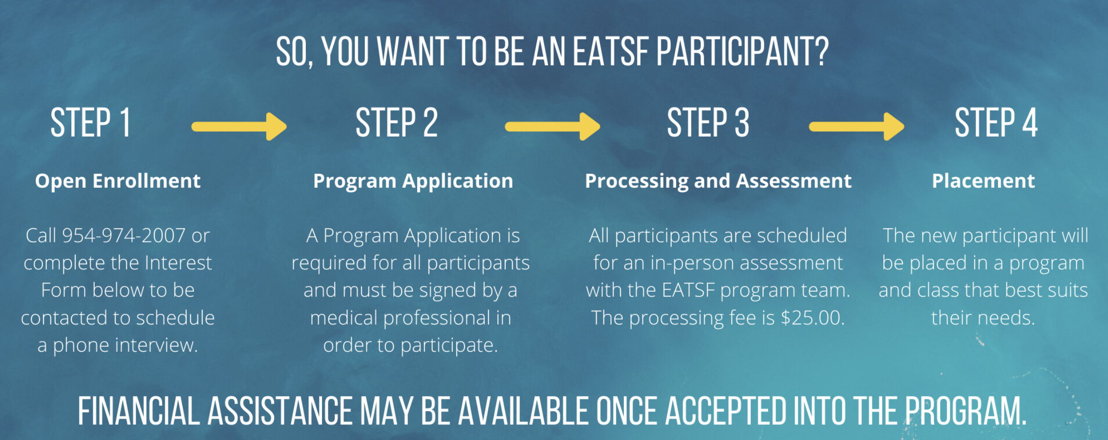 Participants are assessed by trained team members to ensure that they receive the best possible service to meet their needs and goals. After successful enrollment, participants are placed in classes based on their age and ability level. All EATSF programs take place in a clean and safe environment.